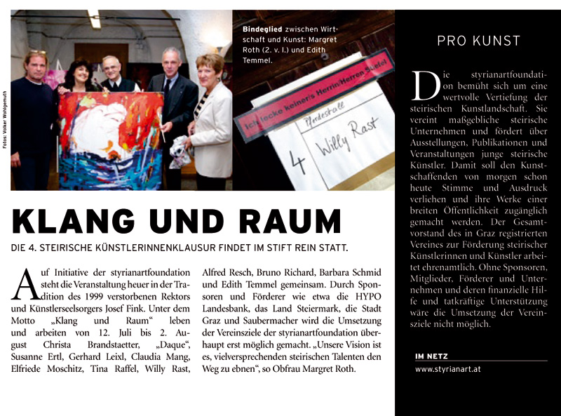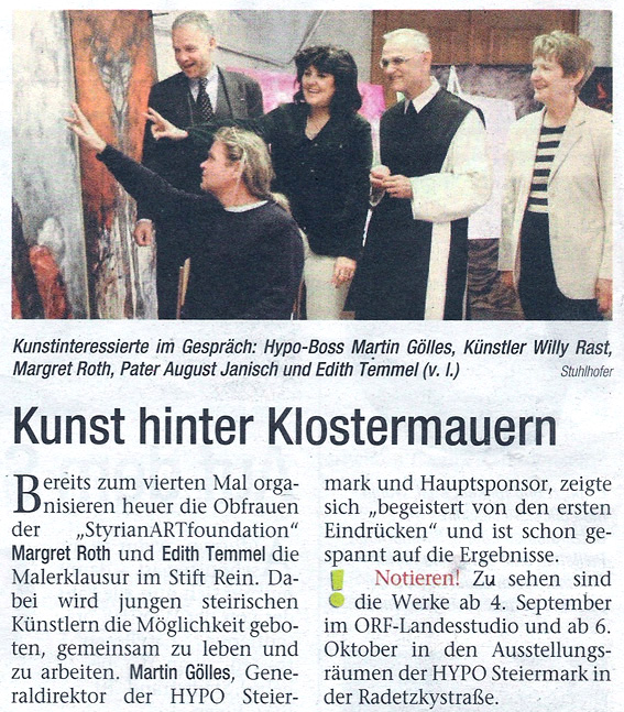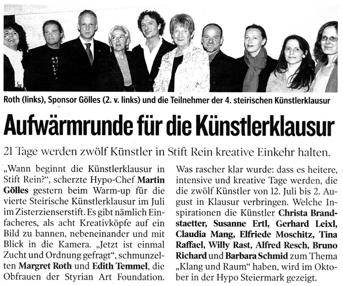 Bereits zum vierten Mal findet heuer die „Steirische Künstler/innen-Klausur“, auf Initiative der styrianARTfoundation, statt. Die Veranstaltung steht in der Tradition des 1999 verstorbenen Rektors Josef Fink, steirischer Priester und Künstlerseelsorger, der als unermüdlicher Vermittler zwischen Gegenwartskunst und Öffentlichkeit fungierte.